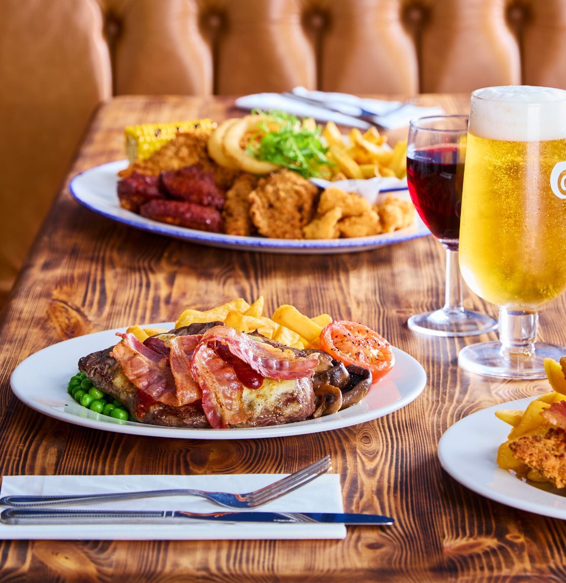 Our pub steak menu at The Cow & Creek is packed with delicious cuts of steak just dripping with flavour. Whether you’re in the mood for rump, sirloin or gammon, you’ll receive a delicious slice of flavour alongside generous helpings of grilled tomato, button mushrooms, garden peas, beer-battered onion rings and satisfying chunky chips. Add in a fiery serving of peppercorn sauce and you’ve got a steak night to remember.